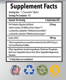 BEST FORMULA FOR PETS: Our natural supplement is made from ingredients that are formulated to help your dog or cat when they need it right away. In this supplement we included two of the most important probiotic digestive aid ingredients, which are L-Acidophilus and L-Salivarious. These contain 250 million active cultures under the probiotics list. Also we included Inulin(FOS) in our supplement because it carries so many positive benefits for your pets health.